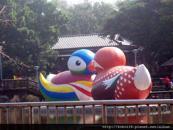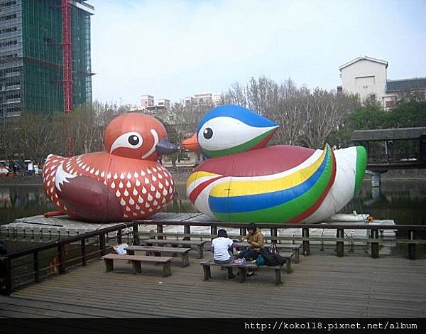 遊客在雙喜鴛鴦前, 悠閒的享受餐點..........
